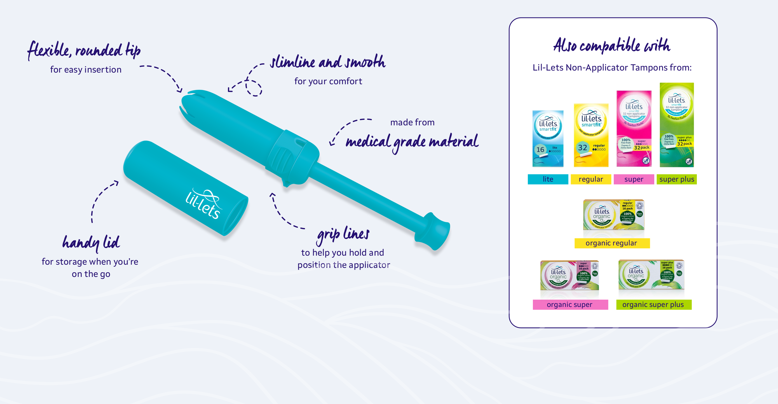 Our reusable applicator comes with organic regular, super and super plus tampons, so you can try some different sizes and find what works for you. However, it’s been designed to fit any tampon from lite to super plus, so whether you have a light or heavy flow it’s got you covered!