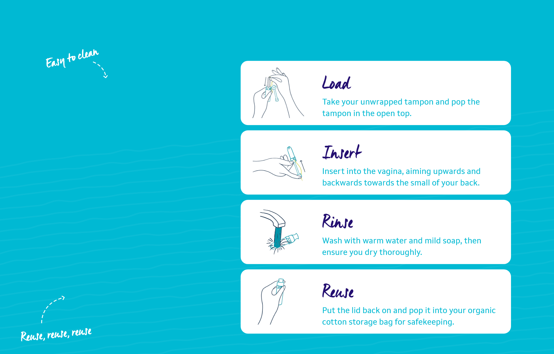 When you’ve finished your period, you’ll need to resterilise your reusable applicator in boiling water (as you did before your first use) and dry it thoroughly. Remember not to boil the lid, instead give it a wipe out with sanitiser. We advise not to put this in your dishwasher. Then keep it stored in your organic cotton bag, in a cool, dry place, ready for your next period.