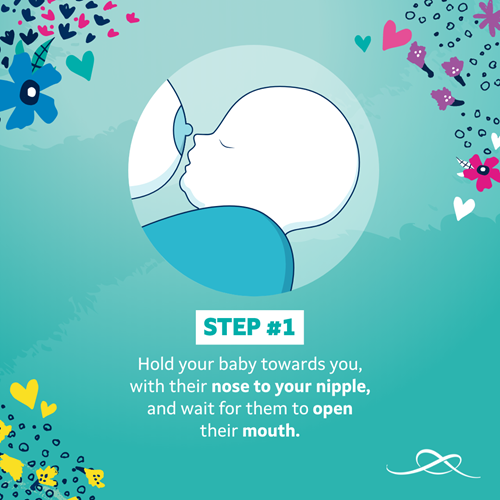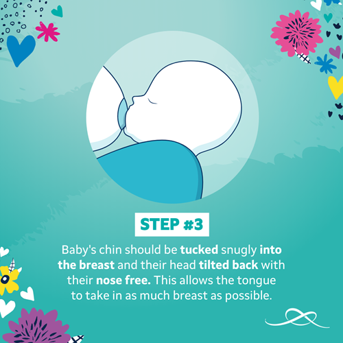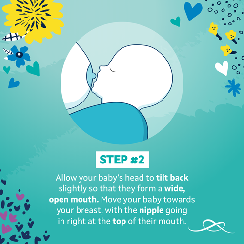 Position your baby in a way that their nose is very close to your nipple. This encourages them to tip their head back and reach forward with their lower jaw. As they tip their head back your baby’s jaw drops and their mouth opens wide, so they can anchor their chin and lower lip firmly against your breast. This helps them create a wide and deep latch which is needed for effective breastfeeding.
