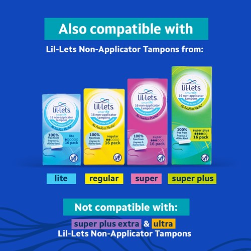 Any non-applicator tampons from the Lil-Lets range will be suitable for use with our reusable applicator. Remember that the applicator will accommodate our Lite, Regular, Super and Super Plus absorbencies!