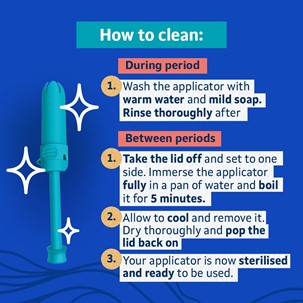 So, let’s get started. To learn how to put a tampon in with an applicator, you need to familiarise yourself with all of the features. We recommend sterilising your reusable applicator before using it. You only need to sterilise the applicator - no need to sterilise or boil the lid.